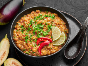 Baingan Bharta is a well-known dish in Bangladesh, India, and Pakistan. In Bangladesh, the dish is known as “Begun Bhôrta”. The primary ingredient is eggplant, which is grilled to infuse it with a smoky aroma.