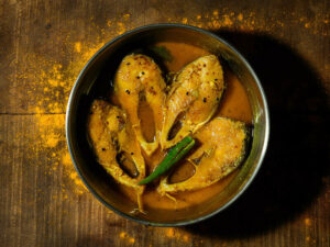 The types of fish commonly used in this dish in Bengali and Odia cuisine include ilish, catla, or rui. There are also smaller-sized fish that are favored for this spicy fish curry.