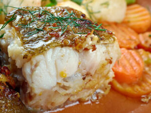 It comprises a cleared and shaved cow foot, including the hoof, that has been slow-cooked with spices and vegetables.