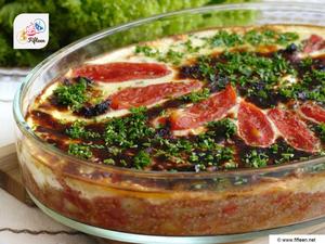 In Bulgaria and other Balkan countries, the dish includes potatoes instead of eggplant and uses pork or beef for the meat layer, with a top layer made from a mixture of milk or yogurt and eggs, sometimes with added flour.