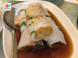 Zaa Leung is a Cantonese dim sum combining crispy Chinese fried dough (youtiao) enveloped in silky rice noodle rolls (cheung fun).
