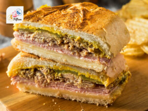 Distinguished by its unique composition, the Cuban sandwich features ham, roasted pork, Swiss cheese, pickles, mustard, and sometimes salami on Cuban bread.