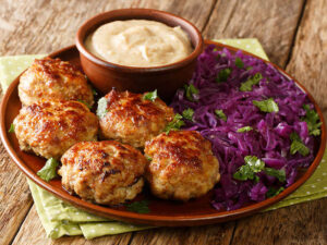 Frikadeller is the Danish version of pan-fried meatballs. It is typically made using minced veal (with beef and pork as possible alternatives), eggs, chopped onions, bread crumbs, and milk.