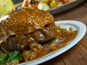 Bøfsandwich is a fascinating Danish sandwich consisting of a thick beef patty served on a bun or a bread roll. While this concept sounds like an American hamburger, what makes it different is that the Danish sandwich is coated in a lot of brown gravy.