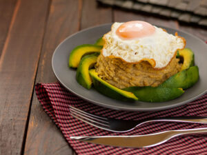Mangu is a traditional Dominican breakfast dish prepared with a bed of boiled and mashed plantains, fried eggs, fried cheese, and sausage. Modern versions can feature additional ingredients, such as avocados.