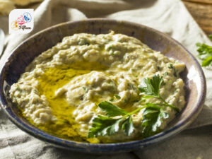 To make this eggplant dip, local cooks bake or broil eggplant directly over an open fire, peel its skin, and mix it with lemon juice, olive oil, tahini, and other seasonings.