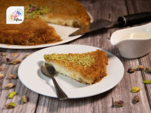 Knafeh, or konafa and kunafa, is a traditional dessert in Egypt, particularly during Ramadan. Knafeh features kataifi (spun pastry) layered with cheese, clotted cream, nuts, or pistachio.