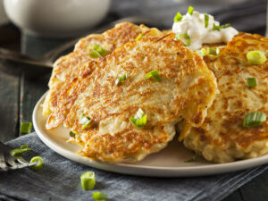 Boxty is a traditional Irish potato pancake, made from a mixture of grated raw potato and mashed potato combined with flour, baking soda, buttermilk, and sometimes egg. The batter is fried in a pan, similar to a pancake.