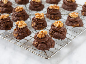 They’re finished with a topping of chocolate icing and a half walnut. Known for their rich texture, which is both soft and crunchy due to the cornflakes, these biscuits are a delightful combination of sweetness and a hint of cocoa bitterness.