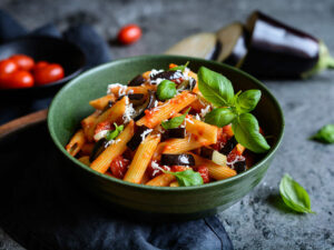 Usually, pasta is tossed in tomato sauce and topped with fried eggplant slices, finished with a sprinkle of ricotta salata cheese for a tangy, hearty flavor. Furthermore, this pasta mix is a popular vegetarian option.