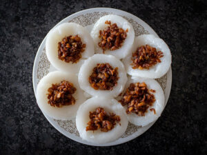 Putu mayam consists of soft and thin steamed rice noodles that are formed into a flat disc-like shape. While South Asians enjoy noodles with various dishes, Singaporeans love to savor it as a snack or street food with granulated sugar or, occasionally, grated coconut.