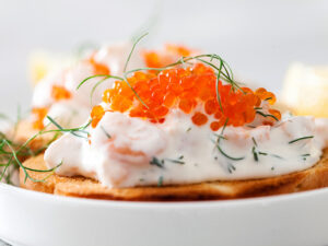Toast skagen, named after a fishing port in Denmark, is a Swedish culinary classic that consists of a mixture of prawns or small shrimp, mayonnaise, and fresh dill, often enhanced with a touch of mustard or lemon, heaped on top of a toasted slice of bread.