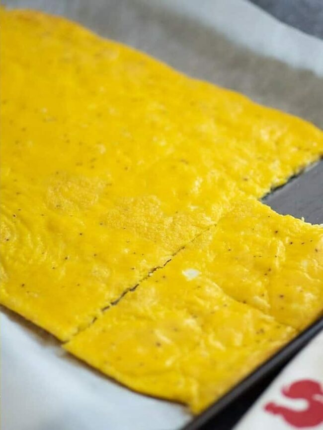 These scrambled eggs bake on a sheet pan, ensuring easy portioning and minimal mess.