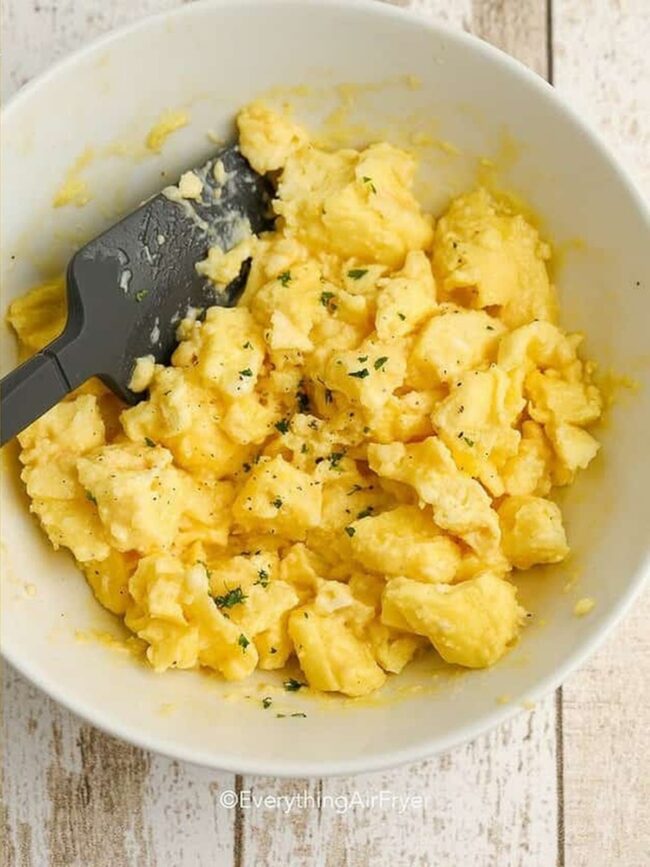 Fluffy scrambled eggs cooked in an air fryer can brighten up any breakfast routine.