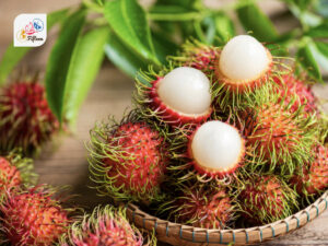 Rambutan is a tropical fruit that is not much larger than a golf ball. Outside, it has some hairs, covering thick, red skin that must be peeled to access a white flesh with a consistency similar to lychee.