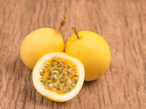 Granadilla, also known as sweet granadilla, is a passion fruit with a hard, orange exterior and a sweet, seedy interior. It is native to South America but has become a beloved exotic fruit in Africa and Australia.