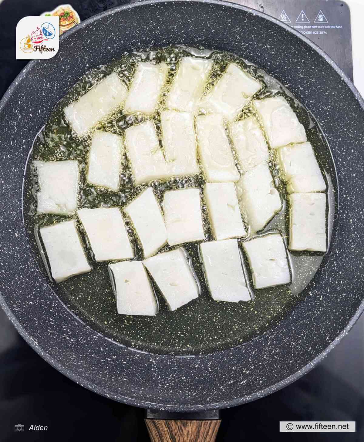 Fried at medium heat for around 5 minutes until all the surfaces are golden brown. Then, continue to fry for another 3 minutes.