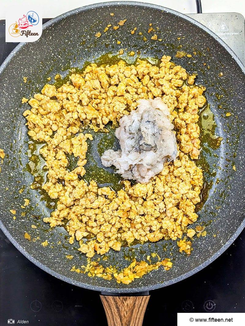Once the meat is 80% cooked, add 7 ounces of ground shrimp and keep stirring.