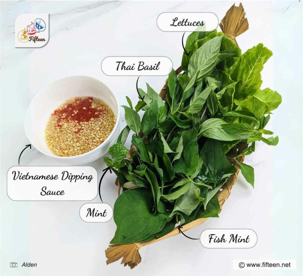 - Fresh herbs assortment: lettuce, fish mint, mint, basil, Vietnamese coriander