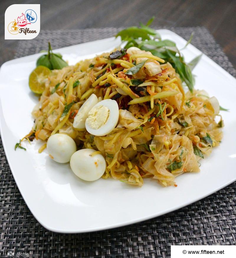 Bánh tráng trộn (Vietnamese rice paper salad) is a famous snack commonly found on the streets of Saigon and other Southern provinces. It is a delectable combination of rice paper with green mango, meat jerky, dried shrimp, roasted peanuts, and other flavor-packed ingredients.