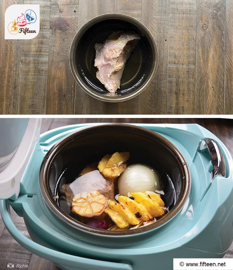 - To a stock pot, add the pork knuckles, the rest of the baked ingredients, 3.5 liters of water, 3 lemongrass stalks, 1 teaspoon of salt, and one teaspoon of brown sugar. Cook on medium heat for 1 hour 30 minutes to 2 hours. Keep the lid off and occasionally skim off the foam to keep the broth clear.