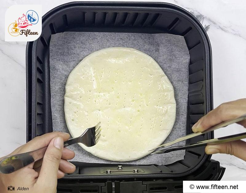 Next, use a fork to carefully puncture the pizza base. Doing this will prevent the pizza from puffing up during air frying.