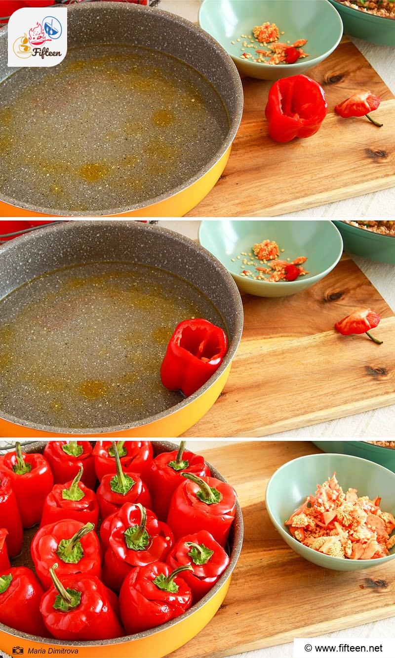 Cut off the top of the pepper with the stalk (pepper cap), as shown in the image. Remove the seeds from the pepper and cover it with the cap. Repeat this for the remaining peppers.