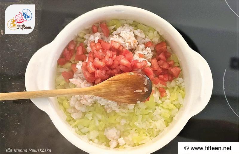 - Preheat the cooking pan and add half of the butter and olive oil. Once the butter melts, sauté onion and green pepper for 5-10 minutes. Stir them occasionally.After 10 minutes, add diced tomatoes and shrimp. Then, season with oregano and salt. Stir-fry these ingredients until there is no water left in the pan.