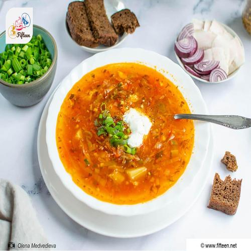 Chop the onion, garlic, and pepper. Grate the carrot. Shred the cabbage and cube the potatoes. Cut the beetroot into small strips. Add the chopped beetroot to the meat broth and let it cook together for another 10-15 minutes.