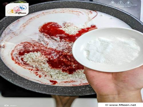 In the skillet, stir-fry the sticky rice with the gấc juice, coconut milk, salt, and sugar.